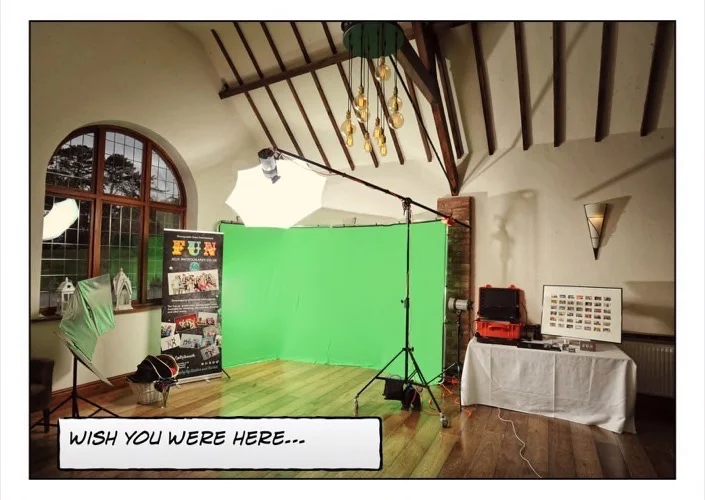 So this is an example of our set up. We took the picture whilst we were waiting for the guests to arrive. The screen is very green isn't it? Green-screen or chromakey photography has been around for a long time (it's what the weather forecasters stand in front of when the read the weather on the telly). It's a colour that doesn't appear much anywhere so that when the computer sees it, it knows to drop the stored picture on it and not on of the top of the subject (if the subject is wearing a chromakey-green dress then we can easily paint it back in - not a problem).